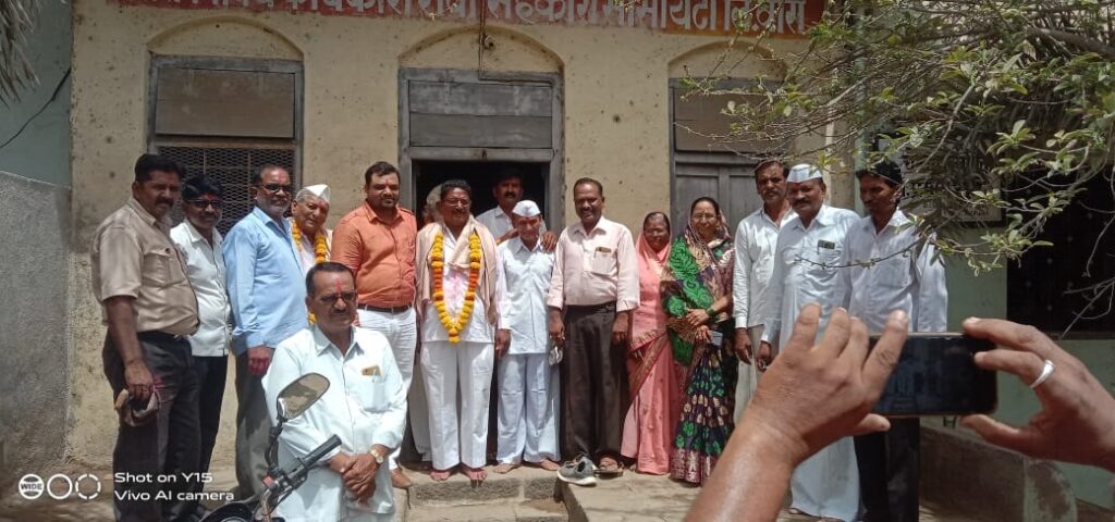 वारी सेवा सोसायटीच्या चेअरमनपदी काळे गटाचे नवनाथ जाधव व व्हा. चेअरमनपदी वाल्मिक जाधव यांची निवडी प्रसंगी त्यांचे अभिनंदन करतांना कार्यकर्ते.
