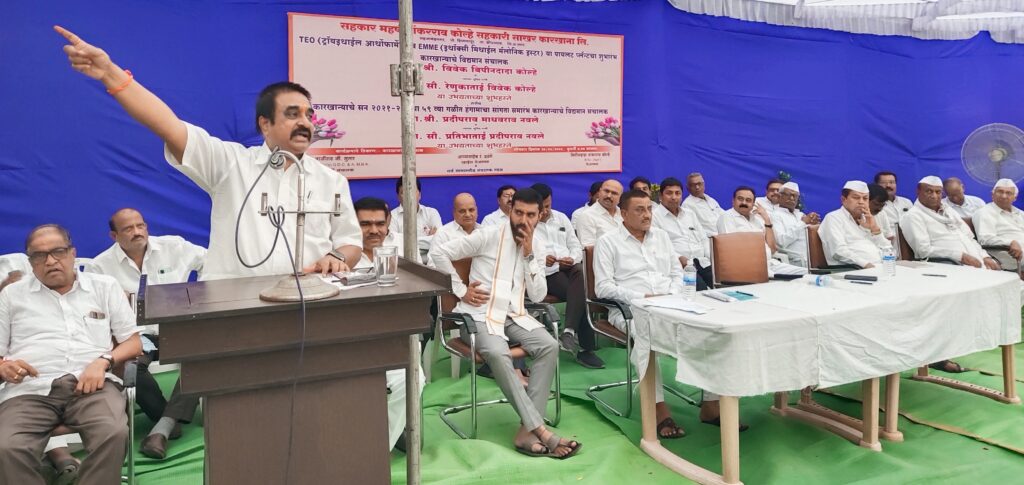 पेट्रोलला पर्याय म्हणून जगात ग्रीन हायड्रोजनवर मोठया प्रमाणात संशोधन सुरू होवुन त्याच्या अमलबजावणीसाठी त्यातील तज्ञ आता पुढे येवू लागले आहेत मात्र माजीमंत्री स्व. शंकरराव कोल्हे यांनी स्वतःच्या अभ्यासातून सभासद शेतक-यांच्या सहकार्यातून नवनविन तंत्रज्ञानाचा आधार घेत काळाच्या कितीतरी अगोदर पुढे जात उसापासून केवळ साखर एके साखर उत्पादन न घेता साखरेबरोबरच हायड्रोजनेशनचा पाया घातला त्यातुन उपपदार्थ निर्मातीबरोबरच औषधी उत्पादने घेतली आणि देशात सर्वप्रथम सहकारी तत्वावर ज्युस पासून इथेनॉल बनविणारा कोल्हे कारखाना ठरला असुन त्याचे लवकरच पेटंट मिळविणार असुन उसाला सर्वाधिक भाव देण्याची संजीवनीची परंपरा पुर्वीपासूनची आहे, चालू गळीतास सभासद शेतक-यांच्या उसाला आणखी जास्तीचा दर १०० रूपये प्रति मे. टन देणार असल्याचे सुतोवाच सहकारमहर्षी शंकरराव कोल्हे कारखान्याचे अध्यक्ष बिपीनदादा कोल्हे यांनी केले. सहकारमहर्षी शंकरराव कोल्हे सहकारी साखर कारखान्यांच्या ५९ व्या गळीत हंगामाची सांगता संचालक प्रदिप नवले, सौ. प्रतिभा नवले यांच्या हस्ते तर माजीमंत्री स्व. शंकरराव कोल्हे यांचे स्वप्न होते सहकारातुन ट्रायईथाइल ऑर्थोफॉर्मेट व इ इथॉक्सी मिथाईल मॅलेनिक ईस्टर हि रासायनिक उपपदार्थ तयार करावयाचे त्याच्या प्रत्यक्ष उत्पादनाचाही शुभारंभ संचालक युवानेते विवेक कोल्हे व सौ. रेणुकाताई कोल्हे यांच्या हस्ते सोमवारी झाला त्याप्रसंगी ते अध्यक्षपदावरून बोलत होते.