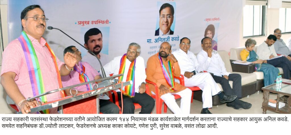 महाराष्ट्रातील सहकारी पतसंस्था बळकटीकरणासाठी महाराष्ट्र शासन सहकार विभागाच्या वतीने जिल्हा स्तरावर तसेच तालुका स्तरावर कार्यशाळा घेऊन पतसंस्था चळवळ बळकट करण्याचा प्रयत्न करीत आहे.या बळकटीकरणाच्या मोहिमेमध्ये महाराष्ट्र राज्य सहकारी पतसंस्था फेडरेशनशी विचार – विनिमय करून सकारात्मक निर्णय घेण्यात येतील.असे प्रतिपादन महाराष्ट्र राज्य सहकार खात्याचे सहकार आयुक्त श्री अनिल कवडे यांनी केले.अहमदनगर जिल्हा उपनिबंधक कार्यालय, महाराष्ट्र राज्य सहकारी पतसंस्था फेडरेशन व अहमदनगर जिल्हा सहकारी पतसंस्था स्थैर्यनिधी संघ यांच्या वतीने शिर्डी येथे महाराष्ट्र सहकारी अधिनियम १९६० चे कलम १४४ व नियामक मंडळ या विषयावर आयोजित कार्यशाळे प्रसंगी ते बोलत होते.याप्रसंगी महाराष्ट्र राज्य सहकारी पतसंस्था फेडरेशनचे अध्यक्ष ओमप्रकाश दादाप्पा तथा काका कोयटे यांनी सहकारी पतसंस्थांच्या वतीने मांडलेल्या विविध विषयांवर बोलताना सहकार आयुक्त श्री अनिल कवडे म्हणाले की, महाराष्ट्रातील सहकारी पतसंस्थांना नाममात्र सभासदांच्या ठेवी स्वीकारण्यासाठी नाममात्र सभासदांचा वेगळा मतदार संघ तयार करून मार्ग काढण्याचा प्रयत्न करण्यात येईल तसेच बँकांना ज्याप्रमाणे ॲसेट रिकन्स्ट्रक्शन कंपनीला आपली थकीत कर्जे विकता येतात, त्याच धर्तीवर महाराष्ट्र राज्य सहकारी पतसंस्था फेडरेशनने ॲसेट रिकन्स्ट्रक्शन को-ऑपरेटिव्ह क्रेडिट सोसायटी स्थापन करण्यासाठी प्रस्ताव तयार करून सहकार खात्याकडे सादर करावा. त्याबाबत सकारात्मक विचार करण्यात येईल. तसेच बँकांना लागू असलेल्या सिबिल रिपोर्टमध्ये महाराष्ट्रातील सहकारी पतसंस्थांचा समावेश होण्यासाठी उच्च स्तरावर सहकार खात्याची बोलणी चालू आहेत, ही बोलणी प्रगती पथावर आहेत. सिबील मध्ये पतसंस्थांचा समावेश झाल्यास पतसंस्थांचा एनपीए कमी होण्यास मदत होईल.