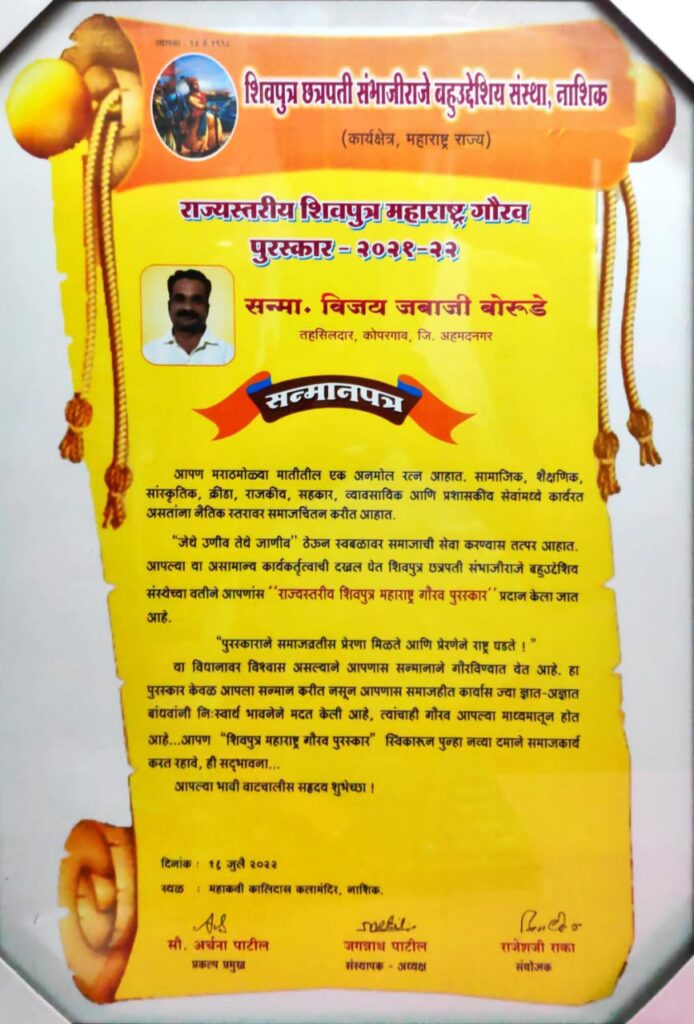 सामाजिक, शैक्षणिक, सांस्कृतिक क्रीडा राजकीय,सहकार अशा विविध क्षेत्रात उल्लेखनीय कार्य करणाऱ्या व्यक्तींचा शिवपुत्र छत्रपती संभाजीराजे बहुद्देशीय संस्था नाशिकच्या वतीने दरवर्षी सन्मान केला जातो, या वर्षीचा राज्यस्तरीय शिवपुत्र महाराष्ट्र गौरव पुरस्कार २०२१-२२ कोपरगावचे तहसीलदार विजय बोरुडे यांना नुकताच नाशिक येथे विविध क्षेत्रातील मान्यवरांच्या उपस्थितीत प्रदान करण्यात आला आहे.तहसीलदार विजय बोरुडे यांनी मागील वर्षी तहसील कार्यालयाचा कार्यभार सांभाळला त्यानंतर त्यांनी अनेक जनहिताचे उपक्रम राबवले असून यामध्ये संजय गांधी श्रावणबाळ निराधार योजनेच्या अंतर्गत तालुक्यातील विविध गावात कॅम्प लावून जवळ जवळ अडीच हजार लोकांना याचा लाभ मिळवून दिला आहे, त्याचबरोबर तहसील कार्यालय येथे आलेल्या नागरिकांना कोणत्याही प्रकारची अडचण येऊ नये यासाठी प्रवेशद्वारावरच एक फलक लावण्यात आलेला आहे आणि कोणतेही महत्त्वाचे काम या असल्यास थेट तहसीलदार यांच्याशी संपर्क साधण्यासाठी स्वतःचा भ्रमणध्वनी क्रमांक दिला आहे. अशी अनेक कामे तहसीलदार बोरुडे यांनी केले आहे. जनसेवेसाठी सदैव तत्पर असलेल्या तहसीलदार विजय बोरुडे यांच्या कार्याचा गौरव व्हावा यासाठी शिवपुत्र संभाजीराजे बहुद्देशीय संस्थेच्या वतीने तहसीलदार बोरुडे यांना राज्यस्तरीय पुरस्कार देऊन सन्मानित करण्यात आले आहे.