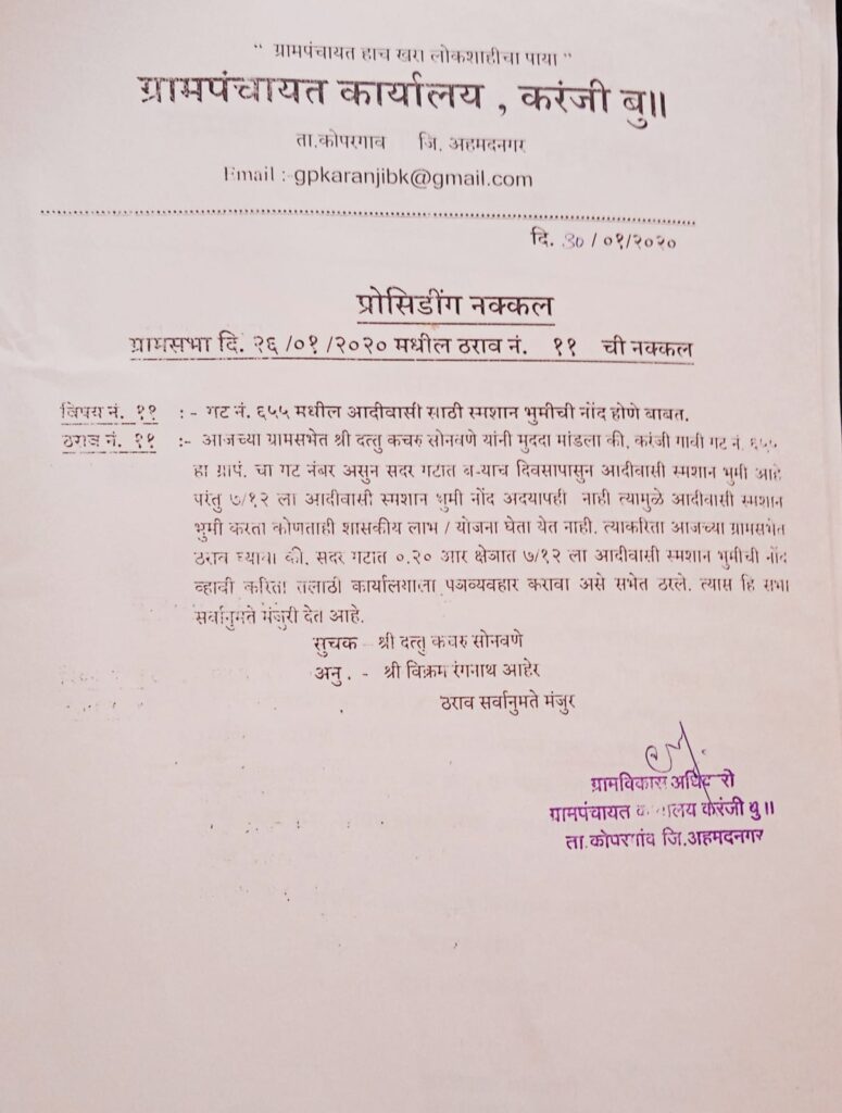 तालुक्यातील करंजी येथील आदिवासी बांधवांच्या स्मशानभूमी जागेचा ठराव २६ जानेवारी २०२० रोजीच्या ग्रामसभेत मंजुर करण्यांत आलेला आहे तेंव्हा याबाबत आमदार आशुतोष काळे यांनी उगाचच श्रेय लाटु नये असे पत्रक उपसरपंच रविंद्र आगवण यांनी प्रसिध्दीस दिले आहे.