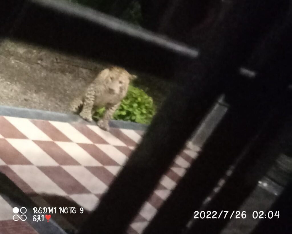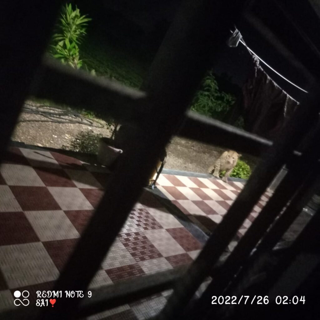 काल दि.२६ जुलै रात्री जेऊर कुंभारी गावातील प्रशांत गिरमे यांच्या घरासमोर रात्री २ वाजण्याच्या सुमारास बिबट्या दिसला. गिरमे यांच्या अंगणात गाई, शेळ्या व कुत्रे हे पाळीव प्राणी होते. कुत्र्याच्या भुंकण्याने गिरमे यांना जाग आली, त्यांनी खिडकीतून बिबट्या दिसल्याने त्यांनी आरडा ओरडा करताच बिबट्या तिथून पसार झाला. पण बिबट्याचे छायाचित्र सीसीटीव्ही कॅमेऱ्यात कैद झालेले आहे. या संदर्भात मा.उपसरपंच जालिंदर चव्हाण यांनी वनविभागाचे अधिकारी सोनवणे मॅडम यांना कळवले मात्र त्यांनी याकडे दुर्लक्ष केले आहे.