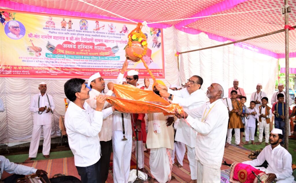 ४७ व्या अखंड हरीनाम सप्ताह सांगता प्रसंगी काल्याची दही हंडी फोडतांना माजी आमदार अशोकराव काळे, ह.भ.प. वाल्मिक महाराज जाधव.