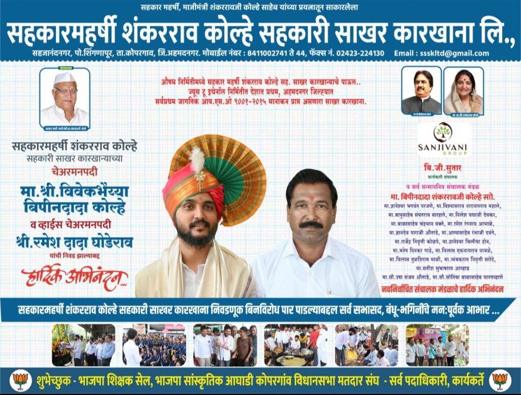 स्व. शंकरराव कोल्हेसाहेब यांनी आपले संपूर्ण जीवन जिरायती भागातील कष्टकरी, गोरगरीब शेतकऱ्यांचे राहणीमान उंचावण्यासाठी खर्ची घातले. कष्टकरी कामगार, शेतकरी व सर्वसामान्य जनतेचे भले व्हावे यासाठी ते आयुष्यभर लढले. समाजातील नाही रे वर्गाचा आवाज बनून त्यांच्या न्याय्य हक्कांसाठी त्यांनी नेतृत्वाची धुरा स्वत:च्या खांद्यावर घेऊन अहर्निश लढा दिला. ग्रामपंचायत, पंचायत समितीपासून ते विधिमंडळापर्यंत सरपंच, सभापती, आमदार, मंत्री आणि सहकार क्षेत्रात विविध पदांवर काम करताना जनहिताला प्राधान्य देत त्यांनी आपल्या कार्याचा वेगळा ठसा उमटवला आहे. स्व. कोल्हेसाहेबांचे व्यक्तिमत्त्व हिमालयासारखे विशाल होते. त्यांंच्या व्यक्तिमत्त्वाला कोहिनूर हिऱ्यासारखी चकाकी होती. अत्यंत प्रतिकूल परिस्थितीवर मात करीत त्यांनी सहकारमहर्षी शंकरराव कोल्हे सहकारी साखर कारखाना (पूर्वीचा संजीवनी सहकारी साखर कारखाना) व संजीवनी उद्योग समुहाचे वैभव निर्माण केले. ऊस, भुसा व साखर या तीन गोष्टींव्यतिरिक्त त्यांनी संशोधन आणि अत्याधुनिक तंत्रज्ञानावर भर देत महाराष्ट्रात सर्वप्रथम रासायनिक उपपदार्थांची निर्मिती सुरू करून हे प्रकल्प यशस्वी करून दाखविले. संजीवनी उद्योग समुहाच्या माध्यमातून कोपरगाव तालुक्यात खऱ्या अर्थाने ङ्गसंजीवनीङ्घ निर्माण करणाऱ्या स्व. शंकरराव कोल्हे साहेबांचे 16 मार्च 2022 रोजी अकाली निधन झाले. स्व. कोल्हे साहेबांच्या निधनानंतर 98 दिवसांनी सहकारमहर्षी शंकरराव कोल्हे सहकारी साखर कारखान्याची निवडणूक प्रक्रिया सुरू झाली. यावर्षी कारखान्याच्या 21 संचालक पदांसाठी तेवढेच म्हणजे 21 च उमेदवारी अर्ज दाखल झाले. संजीवनी उद्योग समुहाचे अध्यक्ष बिपीनदादा कोल्हे व युवा नेते विवेकभैय्या कोल्हे यांच्या मार्गदर्शनाखाली सर्व सभासद शेतकऱ्यांनी ही निवडणूक बिनविरोध करून स्व. शंकरराव कोल्हेसाहेबांना अनोखी आदरांजली अर्पण केली व सहकार क्षेत्रात आदर्श पायंडा पाडला. 21 जुलै 2022 रोजी नवनिर्वाचित संचालक मंडळाच्या बैठकीत कारखान्याचे नूतन अध्यक्ष म्हणून विवेकभैय्या कोल्हे यांच्या नावावर एकमताने शिक्कामोर्तब झाले. याच बैठकीत बिपीनदादा कोल्हे यांनी विश्वरत्न डॉ. बाबासाहेब आंबेडकर यांच्या आदर्श तत्त्वांचा उल्लेख करीत कारखान्याच्या उपाध्यक्ष पदासाठी अनपेक्षितपणे माझ्या नावाची घोषणा केली. हा प्रसंग माझ्यासाठी अतिशय आनंददायी होता.