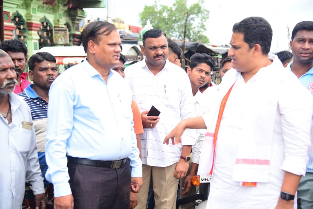 पावसामुळे झालेल्या नुकसानीचे पंचनामे करण्याच्या सूचना तहसीलदार विजय बोरुडे यांना देताना ना.आशुतोष काळे.