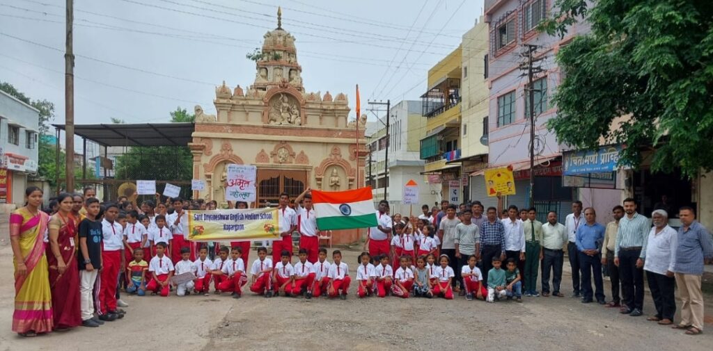 आपल्या भारत देशाला स्वातंत्र्य मिळवून ७५ वर्षे पूर्ण झाले आहेत. त्या निमित्त संपूर्ण देशभरात हा स्वातंत्र्य दिवस “स्वातंत्र्याचा अमृत महोत्सव” म्हणून साजरा करण्याचे योजिले आहे. या महोत्सवानिमित्त संत ज्ञानेश्वर इंग्लिश मिडीअम स्कूल मध्ये चित्रकला, वकृत्व, रांगोळी स्पर्धा व घोष वाक्य बनवा अशा अनेक कार्यक्रमांचे आयोजन करण्यात आले आहे. त्याचाच एक भाग म्हणून “हर घर तिरंगा” या उपक्रमांतर्गत संस्थेचे अध्यक्ष व शिवसेना जिल्हाप्रमुख राजेंद्र झावरे यांच्या मार्गदर्शनाखाली संत ज्ञानेश्वर इंग्लिश मिडीअम स्कूलच्या विद्यार्थी व शिक्षकांनी कोपरगाव नगरीत प्रभात फेरी काढून जनजागृती केली. प्रभातफेरी वेळी विद्यार्थी व शिक्षकांनी “भारत माता की जय”,”वंदे मातरम” व “हर घर तिरंगा” आशा देशभक्ती पर घोषणा देत या स्वातंत्र्याच्या अमृत महोत्सवा निमित्ताने प्रत्येक घरावर तिरंगा फडकविण्यासाठी जनजागृती करण्यात आली. कोपरगावतील नागरिकांनी फेरीत सहभागी झालेल्या विद्यार्थी व शिक्षकांना शुभेच्छा दिल्या. तसेच विद्यार्थी व शिक्षकांनी विविध घोष वाक्य तयार करून प्रभात फेरी च्या माध्यमातून नागरिकांना त्यातून देशभक्तीचे संदेश दिले. विद्यार्थ्यांनी या प्रभात फेरीच्या माध्यमातून जनजागृती केल्याने सर्वत्र त्यांचे कौतुक होत आहे. या वेळी संत ज्ञानेश्वर विद्या प्रसारक संस्थेचे कार्यकारी विश्वस्त विशाल झावरे, प्राचार्य सचिन मोरे,उपशिक्षिका वैशाली लोखंडे, वसुधा झावरे,प्रियांका शेलार,प्रियांका फाटक्कर,पूनम सूर्यवंशी,अनुप गिरमे,सागर खटावकर,शिक्षकेत्तर कर्मचारी अक्षय नन्नावरे,रवींद्र पवार, चंद्रहंस पाबळे, सतिश लोळगे आदी उपस्थित होते.