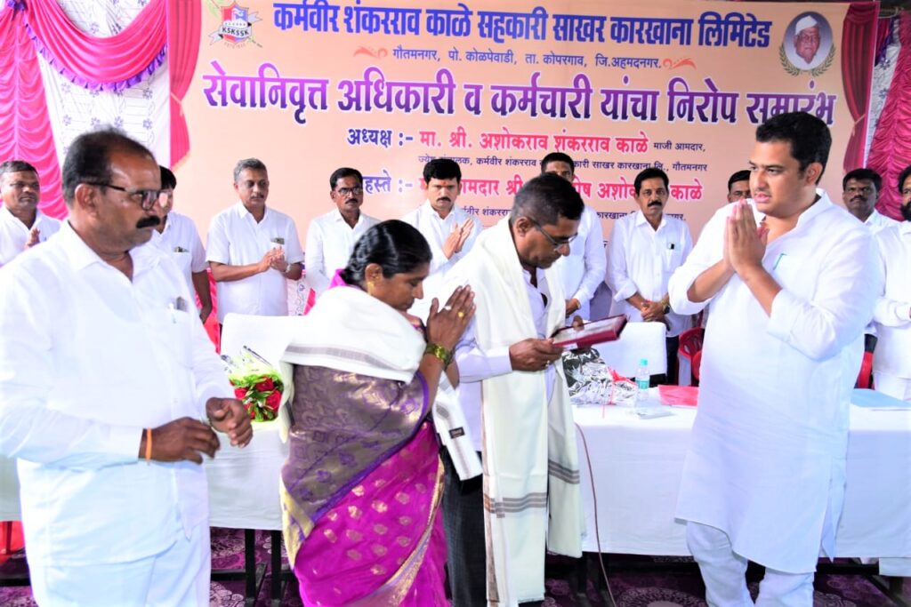कर्मवीर शंकरराव काळे सहकारी साखर कारखाना व आसवनी विभागातील कर्मचा-यांचा सेवा निवृत्तीनिमित्त सत्कार समारंभ प्रसंगी मा.आमदार अशोकराव काळे, कारखान्याचे चेअरमन आ. आशुतोष काळे, समवेत, व्हा. चेअरमन दिलीपराव बोरनारे, संचालक मंडळ व पदाधिकारी.