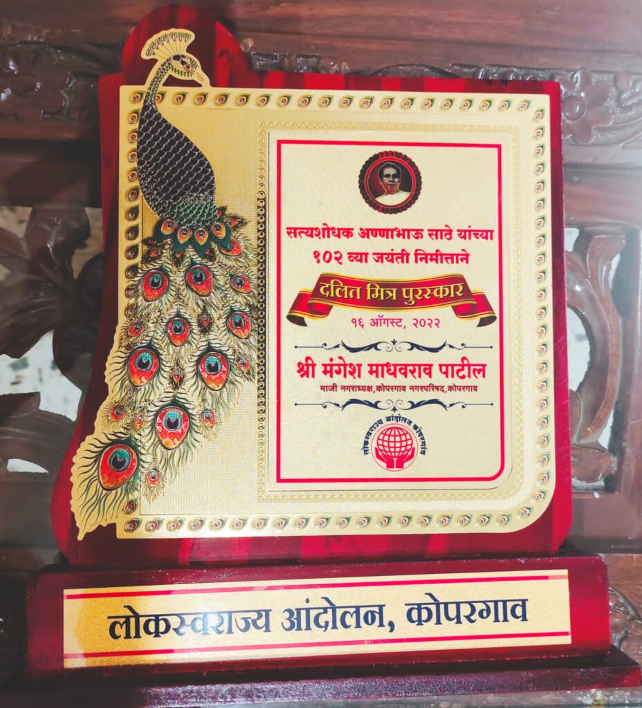 सत्यशोधक आण्णा भाऊ साठेच्या १०२ व्या जयंती कार्यक्रम निमित्त जेष्ठ साहित्यिक , इतिहासकार , माजी जिल्हाधिकारी ” पानीपतकार” विश्वास पाटील यांचे हस्ते पुरस्कार देऊन मंगेश पाटील , सौ.वैशाली उल्हारे मॅडम (जगधनी क्लासेस) , सागर आहेर यांना सन्मानित करण्यात आले.या वेळी पतसंस्था फेडरेशनचे अध्यक्ष काकासाहेब कोयटे , माजी नगराध्यक्ष विजयराव वहाडणे , अँड.नितीन पोळ , राजेंद्र बागुल उपस्थित होते.