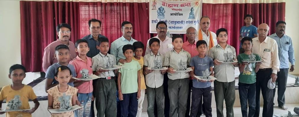 ब्राह्यण सभा.कोपरगांवच्या विदयमाने पर्यावरण पुरक इको फ्रेंडली शाडु माती चे गणेश मुर्ती तयार करण्याची कार्यशाळेचे आयोजन नुकतेच करण्यात आले होते. या उपक्रमामध्ये कोपरगांवातुन विविध शाळेतील ५८ विद्यार्थी व व्यक्तींनी सहभाग घेतला. या कार्यशाळेच्या समारोप प्रसंगी ब्राह्यण सभेचे अध्यक्ष श्री.मकरंद को-हाळकर यांनी विदयार्थींना मार्गदर्शन केले त्या प्रसंगी ते म्हणाले की गणेश उत्सवाच्या पार्श्वभूमीवर इको फ्रेंडली शाडु माती गणेश मुर्ती तयार करणे पर्यावरण पुरक आहे. कारण त्यामुळे पर्यावरणाचा -हास थांबतो. त्यामुळे कार्यशाळेचे आयोजन सातत्याने होणे आवश्यक आहे.
