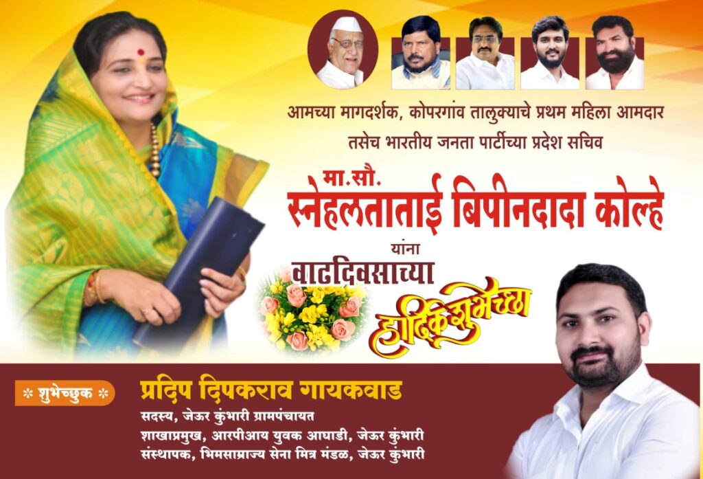 सौ.स्नेहलताताई कोल्हे यांना वाढदिवसाच्या हार्दिक शुभेच्छा.शुभेच्छुक-जेऊर कुंभारी ग्रामपंचायत सदस्य प्रदिप गायकवाड