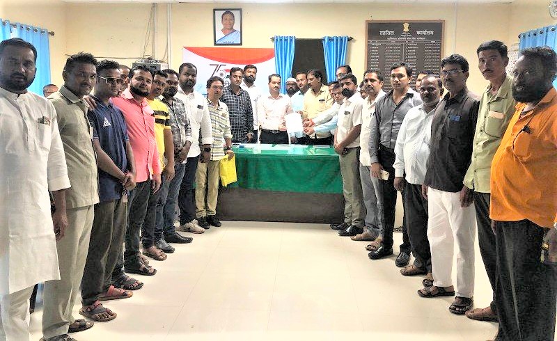 ५ नंबर साठवण तलावाच्या उत्खननामधून उपलब्ध होणारा मुरूम व दगड रस्त्यांसाठी उपलब्ध करून द्यावा अशा आशयाचे निवेदन देतांना राष्ट्रवादी कॉंग्रेसचे पदाधिकारी.