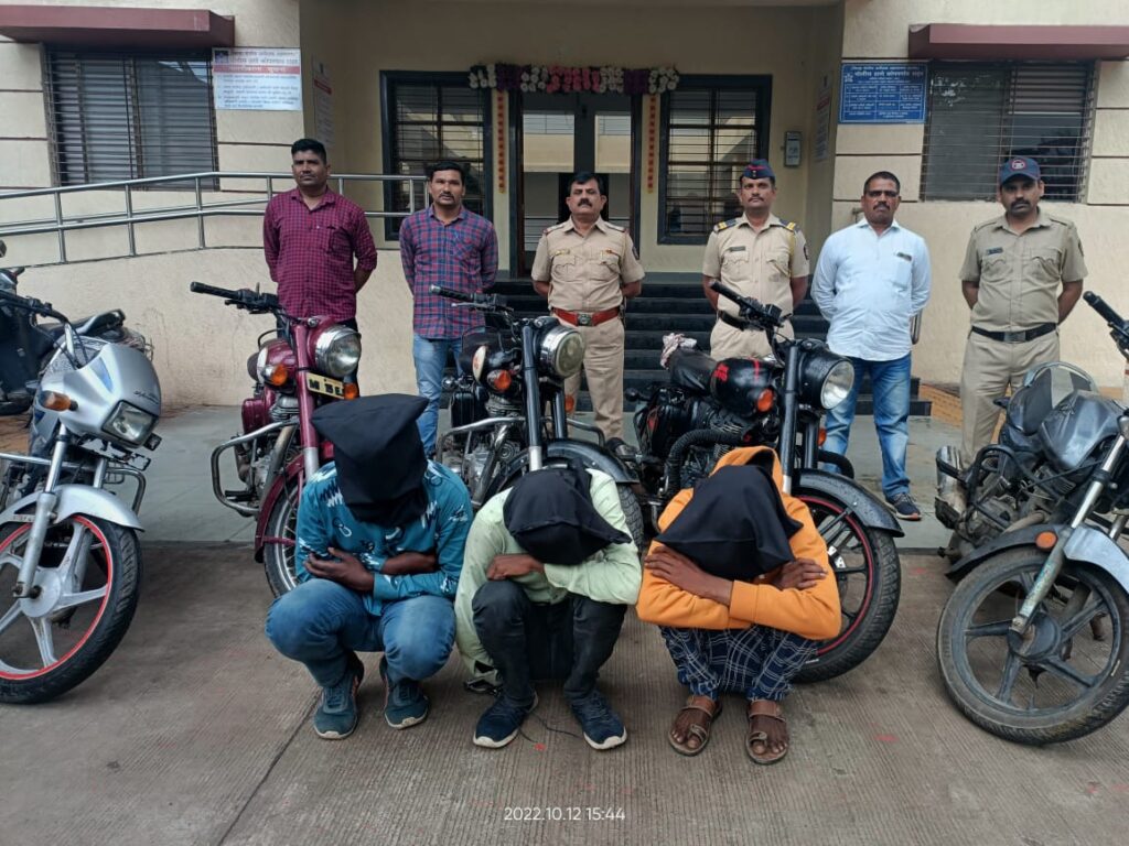 कोपरगाव शहर पोलिस स्टेशन हद्दीतील औद्योगिक वसाहत परिसरातून शहर पोलिसांच्या पथकाने तब्बल ८ लाख ६५ हजार रुपये किंमतीच्या वेगवेगळ्या कंपनीच्या तब्बल १३ दुचाकीसह ३ आरोपींना जेरबंद केले. रविवार दि ९ ऑक्टोबर २०२२ रोजी कोपरगाव शहर पोलीस निरीक्षक वासुदेव देसले यांना त्यांच्या गोपनीय बातमीदारामार्फत माहिती मिळाली की, दोन इसम हे कोपरगाव शहर पोलिस स्टेशन हद्दीतील शिंगणापूर व औद्योगिक वसाहत येथे चोरीची मोटार सायकल बुलेट विक्री करण्यासाठी येणार आहे अशी माहिती पोलीस निरीक्षक देसले यांना मिळाल्याने त्यांनी तत्काळ पोलीस हेडकॉन्स्टेबल पुंड, पोलीस कॉन्स्टेबल तमनर, पोलीस कॉन्स्टेबल शिंदे, पोलीस कॉन्स्टेबल कुऱ्हाडे यांचे पथक नेमून योग्य ते मार्गदर्शन करत कारवाई करण्याचे आदेश दिले असता सदर पोलिस पथकातील कर्मचारी शहर पोलीस ठाणे हद्दीतील माहिती मिळालेल्या औद्योगिक वसाहत परिसरात सापळा लावून बसले असतांना त्या क्षणी दोन अज्ञात इसम हे विना नंबरच्या बुलेट मोटरसायकल वरून संशयितरित्या वेगात जाताना दिसल्याने पोलिस पथकाने तत्काळ त्यांचा पाठलाग करून त्यांना पकडून त्यांचे नाव गाव विचारले असता त्यातील एकाने आपले नाव किशोर साहेबराव कापसे (वय २१ वर्षे) व दुसऱ्याने सचिन अंबादास कापसे (वय २० वर्ष) सांगत राहणार तागडी तालुका चांदवड जिल्हा नाशिक असे पोलिसांना सांगितले असता पोलीसांनी त्यांच्याकडील विना क्रमांकाच्या बुलेट मोटर सायकलच्या कागदपत्रा बाबत विचारपूस करताच त्यांनी पोलिसानी उडवा उडवी चे उत्तरे देयला सुरुवात केली असता पोलिसांनी आपल्या पोलिसी खाक्या दाखवत चौकशी केली असता त्या दोघांनी दिली त्यांचा तिसरा साथीदार चेतन रमण कापसे वय १९ याच्यासह वेगवेगळ्या ठिकाणाहून चोरी केलेल्या वेगवेगळ्या कंपनीच्या तब्बल ८ लाख ६५ हजार रुपये किमतीच्या १३ दुचाकी काढून दिल्या असून त्या कोपरगाव शहर पोलिसांनी ताब्यात घेतल्या आहे.