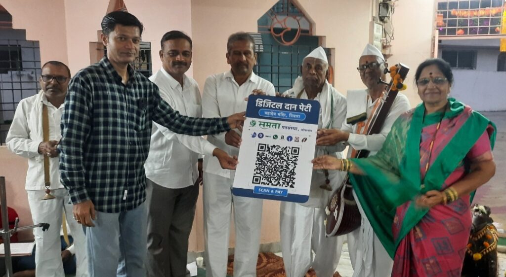 तंत्रज्ञानात नेहमीच अग्रेंसर असलेल्या कोपरगाव शहरातील समता पतसंस्थेने यासाठी पुढाकार घेतला आहे. तेथील निवारा परिसरात असलेल्या महादेव मंदिरात या डिजिटल दानपेटीचा लोकार्पण सोहळा शनिवारी मोठ्या उत्साहात पार पडला. महादेव मंदिर कमिटीच्या वतीने कोपरगाव नगरपालिकेच्या माजी नगराध्यक्षा सुहासिनी कोयटे, निवारा भजनी मंडळाचे प्रमुख बाबासाहेब कापे, माऊली गायकवाड, वाकचौरे महाराज यांनी ही डिजिटल दानपेटी स्वीकारली.धनत्रयोदशीच्या मुहूर्तावर सुरू करण्यात आलेल्या या उपक्रमाबद्दल अधिक माहिती देताना निवारा परिसराचे माजी नगरसेवक जनार्दन कदम म्हणाले, ‘डिजिटल दानपेटी देऊन समता नागरी सहकारी पतसंस्थेने डिजिटल क्रांतीत बाजी मारली आहे. या दानपेटीमुळे मंदिरातील दानपेटी चोरीस जाण्याचे प्रकार आता यापुढे घडणार नाहीत; तसेच पूर्वी वापरात असलेली दानपेटी उघडल्यानंतर सुट्टे पैसे मोजण्यासाठीचा होणारा त्रासदेखील होणार नाही. शिवाय भाविकांनी केलेले सर्व दान महादेव मंदिर कमिटीच्या नावाने समता पतसंस्थेत असलेल्या बचत खात्यात रोज जमा होईल. या रकमेवर ७ टक्के व्याजही मिळेल.’समता पतसंस्थेचे सहायक सरव्यवस्थापक संतोष मुदबखे यांनी या डिजिटल दानपेटीविषयी विस्तृत माहिती दिली. ते म्हणाले, ‘समता पतसंस्थेचे चेअरमन काका कोयटे यांच्या मार्गदर्शनाखाली अत्याधुनिक तंत्रज्ञानाचा अवलंब करण्यात समता नागरी सहकारी पतसंस्था अग्रेसर असून, समताने आधुनिक तंत्रज्ञानाच्या बाबतीत जागतिक पातळीवर देखील कीर्ती मिळविली आहे. जागतिक पातळीवरील डिजिटल दानपेटीचा हा पहिलाच प्रयोग आहे. या दानपेटीच्या अनुषंगाने सर्व भाविकांचे डिजिटल दानही सुरक्षित होईल.’याप्रसंगी निवारा भजनी मंडळाचे हौशीराम बर्गे, दिलीप संगमनेरे, प्रवीण कोल्हे, विजय कांगुने, जोशी गुरू, तसेच निवारा महिला भजनी मंडळाच्या महिला, निवारा परिसरातील भाविक मोठ्या प्रमाणात उपस्थित होते.समता पतसंस्थेतर्फे कोपरगावातील निवारा परिसरात असलेल्या महादेव मंदिरात शनिवारी डिजिटल दानपेटीचा लोकार्पण सोहळा पार पडला. याप्रसंगी उपस्थित मान्यवर.
