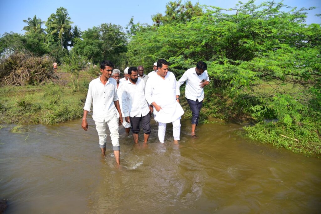 कोपरगाव विधानसभा मतदार संघातील राहाता तालुक्यात समाविष्ट असलेल्या अनेक गावात अतिवृष्टीमुळे झालेल्या नुकसानीची आ.आशुतोष काळे यांनी पाहणी करून नुकसान ग्रस्तांना तातडीने मदत मिळण्यासाठी युद्धपातळीवर कार्यवाही करा अशा सूचना त्यांनी प्रशासनाला दिल्या आहेत. मागील काही दिवसांपासून परतीच्या पावसाचे राज्यभर थैमान सुरूच असून गुरुवार (दि.२०) रोजी मध्यरात्रीपासून पहाटेपर्यंत झालेल्या ढगफुटी सदृश्य पावसाने दाणादाण उडवून देत संपूर्ण कोपरगाव मतदार संघाला झोडपून काढले. त्यामुळे शेतातील उभ्या पिकांचे तर मोठे नुकसान झालेच तर त्याचबरोबर सर्वत्र पाणीच पाणी साचून हे पाणी नागरी वस्तीत शिरल्यामुळे सखल भागातील नागरिकांच्या घरातील घरातील संसारोपयोगी साहित्यांचे मोठे नुकसान झाले. शेत्तातील अनेक वस्त्यांना बेटाचे स्वरूप प्राप्त झाल्यामुळे नागरिकांना पाणी ओसरण्याची वाट पाहण्याशिवाय गत्यंतर राहिले नव्हते. मतदार संघातील नागरिकांचे ढगफुटी सदृश्य पावसाने झालेल्या नुकसानीचे तातडीने पंचनामे करण्याच्या सूचना आ. आशुतोष काळे यांनी गुरुवार (दि.२०) रोजीच प्रशासनाला दिल्या होत्या. त्याबाबत झालेल्या नुकसानीचा आढावा घेवून प्रशासनाने काय कार्यवाही केली याची आ.आशुतोष काळे यांनी नुकतीच राहात्याचे नायब तहसीलदार भाऊराव भांगरे, कामगार तलाठी वर्षा कावनपुरे, श्रीम. भारती लोखंडे, सोमनाथ शिंदे, ग्रामविकास अधिकारी तुळशीदास दिनकर, प्रमोद कानडे, सतीश दिघे, कृषी सहाय्यक किरण शिंदे, अजय डाके, संदीप गायकवाड आदी अधिकाऱ्यांच्या समवेत नपावाडी, शिंगवे, रस्तापूर आदी गावातील झालेल्या नुकसानीचा आढावा घेवून प्रशासनामार्फत करण्यात आलेल्या पाठपुराव्याची माहिती जाणून घेतली. गुरुवार (दि.२०) रोजी झालेल्या नुकसानीचे पंचनामे तातडीने शासनाकडे पाठवा व लवकरात लवकर नुकसानग्रस्तांना मदत द्या काही अडचणी आल्यास माझ्याशी संपर्क करा अशा सूचना आ.आशुतोष काळे यांनी यावेळी दिल्या. नपावाडी, शिंगवे, रस्तापूर आदी गावातील अतिवृष्टीमुळे झालेल्या नुकसानीची भरपाईबाबत प्रशासनाला सूचना करतांना आ. आशुतोष काळे.