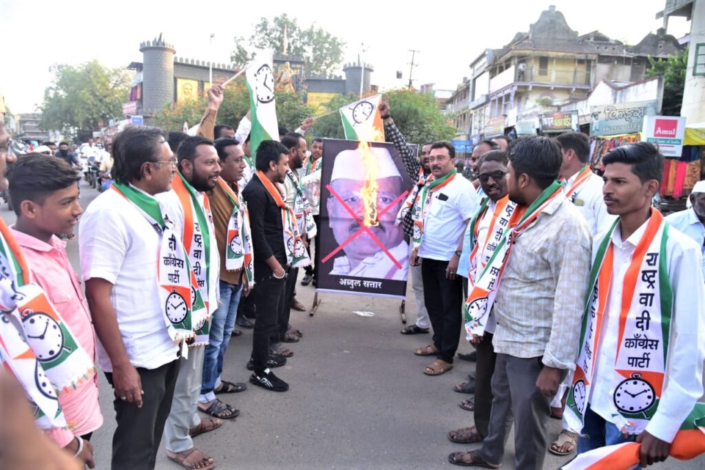 कृषीमंत्री अब्दुल सत्तार यांनी संसदरत्न खा. सुप्रिया सुळे यांच्याबाबत शिवराळ भाषेचा वापर करून केलेल्या आक्षेपार्ह वक्तव्याबद्दल राज्यात राष्ट्रवादी काँग्रेस पक्षाचे कार्यकर्ते आक्रमक झाले असून त्याचे पडसाद कोपरगाव तालुक्यात देखील पडले आहे.राष्ट्रवादी कॉंग्रेस पक्षाचे आ.आशुतोष काळे यांच्या मार्गदर्शनाखाली कोपरगाव शहरातील श्री छत्रपती शिवाजी महाराजांच्या पुतळ्याजवळ निषेध आंदोलन करण्यात आले. यावेळी राष्ट्रवादी कॉंग्रेसच्या पदाधिकारी व कार्यकर्त्यांनी कृषीमंत्री अब्दुल सत्तार यांच्या प्रतिमेला जोडे मारून ती प्रतिमा जाळून निषेध व्यक्त केला.खा. सुप्रिया सुळे यांच्याबाबत केलेल्या आक्षेपार्ह वक्तव्याबद्दल राज्यभरातून त्यांचा निषेध केला जात असतांना कोपरगावमध्ये देखील राष्ट्रवादी कॉंग्रेस पक्षाचे कार्यकर्ते आक्रमक झालेले पहायला मिळाले. यावेळी राष्ट्रवादी कॉंग्रेसचे कार्याध्यक्ष संदीप वर्पे म्हणाले की, राज्याचे कृषीमंत्री अब्दुल सत्तार यांनी खा. सुप्रिया सुळे यांच्याबाबत केलेल्या वक्तव्याचा जाहीर निषेध करतो. खा. सुप्रिया सुळे महाराष्ट्राचे भूषण आहेत. सलग सात वेळा संसदरत्न पुरस्कार मिळविणाऱ्या देशाच्या त्या एकमेव खासदार आहेत. अशा व्यक्तीबद्दल त्यांनी निंदनीय वक्तव्य केले त्याचा निषेध करीत आहे. ५० खोक्याचा विषय मोठ्यापासून लहानापर्यंत चर्चिला जात आहे. कुठे तरी सत्तेची गुर्मी दिसत असून महिलांच्या बाबतीत सत्ताधारी मंत्र्यांकडून आक्षेपार्ह वक्तव्य केले जात आहे. देशामध्ये महिला धोरण राबविण्यात शरदचंद्रजी पवार यांचा पुढाकार होता, महिला आरक्षण त्यांच्यामुळे मिळाले त्यांच्या कन्येबद्दल खालच्या पातळीवरून जावून वक्तव्य केल्यामुळे राज्य सरकारने त्यांचा तातडीने राजीनामा घ्यावा अन्यथा याचे चुकीचे पडसाद उमटून कायदा सुव्यवस्थेची परिस्थिती निर्माण झाल्यास त्याची सर्वस्वी जबाबदारी सरकारची राहील असा ईशारा दिला आहे. यावेळी शहराध्यक्ष सुनील गंगुले म्हणाले की, छत्रपती शिवाजी महाराज, फुले, शाहू, आंबेडकरांचा महाराष्ट्र महिलांचा आदर करीत आला आहे. कृषीमंत्री अब्दुल सत्तार यांनी खा. सुप्रिया सुळे यांच्याबाबत आक्षेपार्ह वक्तव्य केल्याबद्दल सरकारने त्यांचा राजीनामा घ्यावा अन्यथा त्यांना आम्ही महाराष्ट्रात फिरू देणार नाही. राष्ट्रवादी युवक शहराध्यक्ष नवाज कुरेशी व जलील अत्तार म्हणाले की, कृषीमंत्री अब्दुल सत्तार यांनी केलेले वक्तव्य महाराष्ट्रासाठी व सर्व महिला भगिनींसाठी निंदनीय आहे.सरकारने त्यांचा राजीनामा घ्यावा. यावेळी राष्ट्रवादी कॉंग्रेसचे कार्याध्यक्ष संदीप वर्पे, शहराध्यक्ष सुनील गंगुले, महिला जिल्हा स