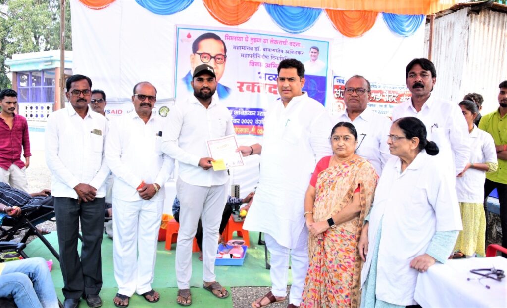 महापरिनिर्वाण दिनानिमित्त आयोजित रक्तदान शिबिरात रक्तदान करणाऱ्या रक्तदात्यांना प्रमाणपत्र वाटप करतांना आ. आशुतोष काळे.